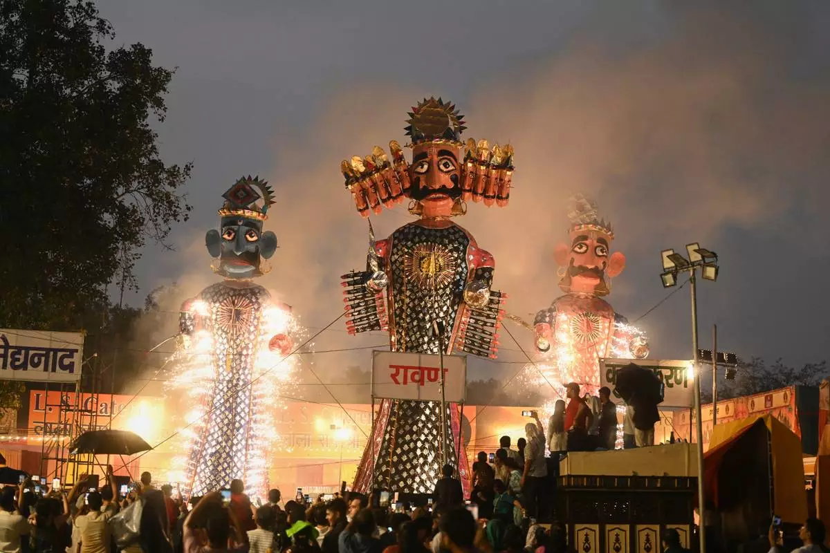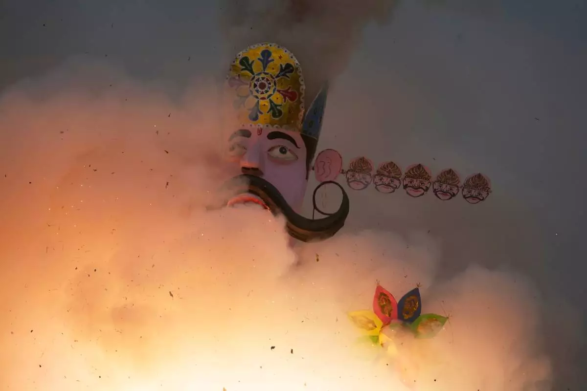 The festival of Dussehra ends with flames, as enormous effigies of the demon King Ravana collapse in roaring pyres, a dramatic celebration of Hindu deity Lord Rama’s victory and a reminder that arrogance and cruelty can be consumed by fire. Smoke and thunder echo through the night, blending devotion and spectacle.