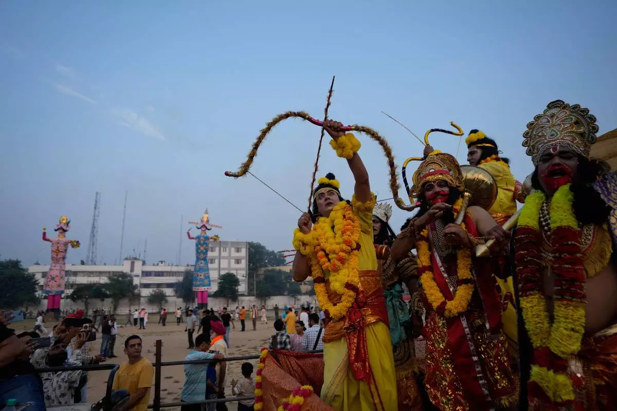 Artists dressed up as Hindu gods shout religious slogans during Dussehra festivities in Jammu, India, Thursday, Oct.2, 2025.(AP Photo/Channi Anand)