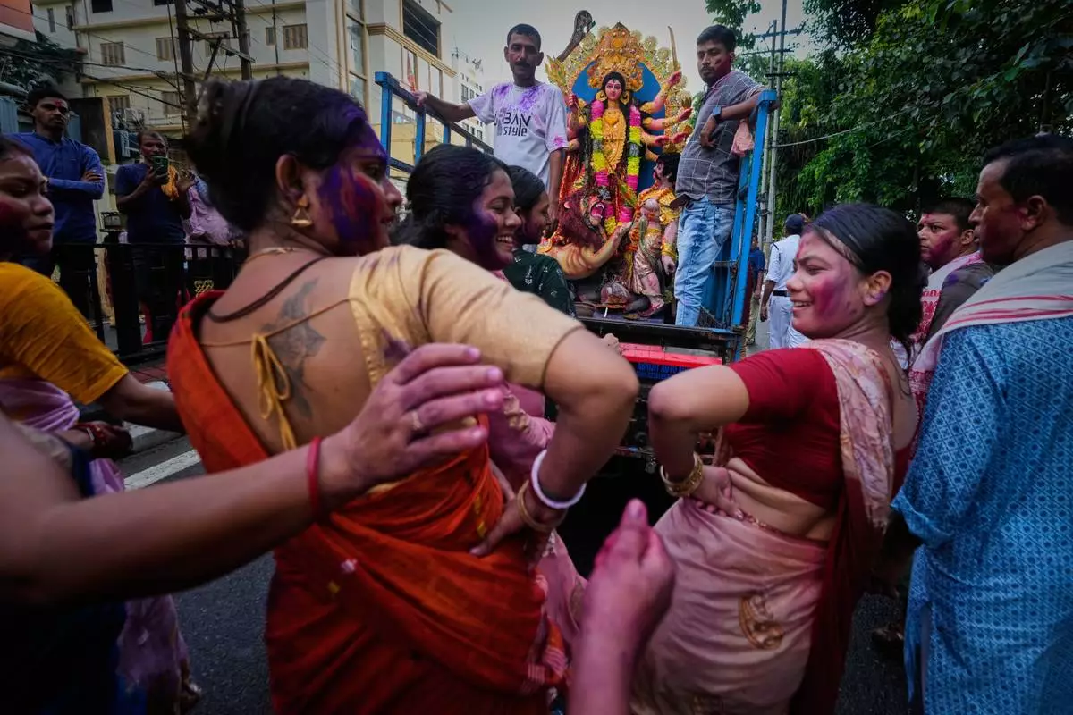 Across eastern India, Bangladesh and parts of Myanmar, the festival ended with vibrant processions — music pounding, drums rolling, crowds chanting — carrying statues of the goddess Durga to rivers and ponds. There, amid song and splashing water, her clay form is immersed, dissolving into the currents. The ritual is both a farewell and a renewal, a riot of sound and color.