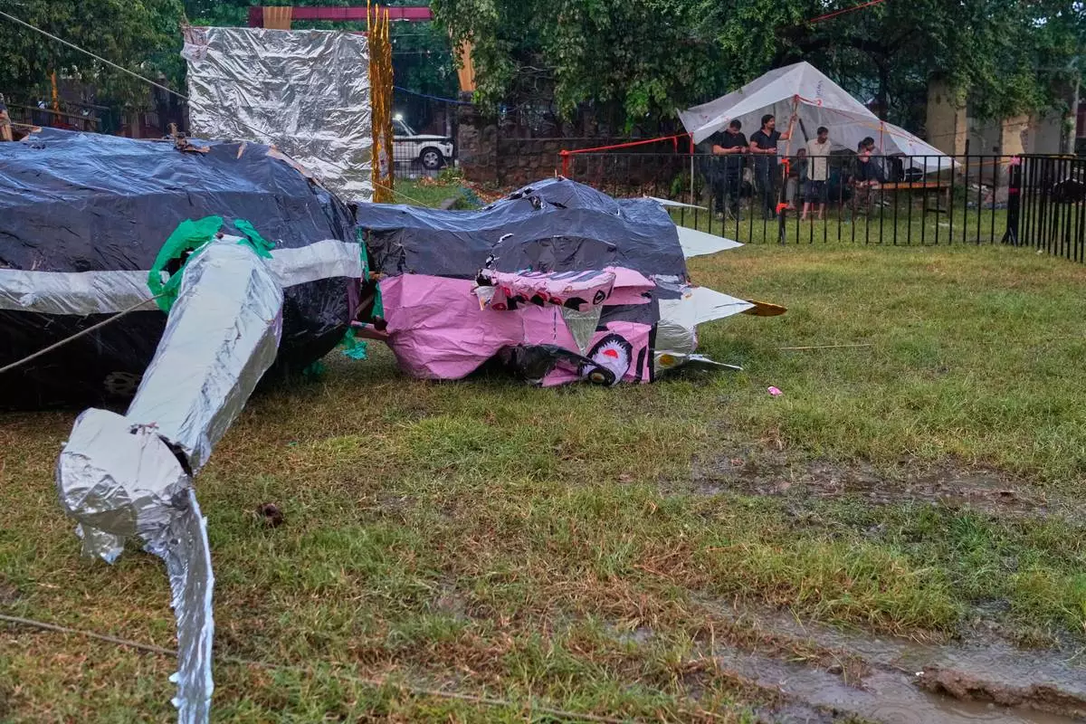 Organizers shelter under umbrellas and plastic sheeting as a sudden rain and thunderstorm causes the effigy of demon king Ravan and others to fall and sustain water damage during the Hindu festival of Dussehra in New Delhi, India, Thursday, Oct. 2, 2025. (AP Photo/Manish Swarup)