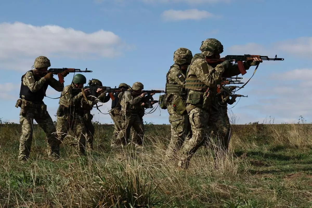 In this photo provided by Ukraine's 65th Mechanized Brigade press service, recruits run drills at a training ground in the Zaporizhzhia region, Ukraine, Friday, Sept. 26, 2025. (Andriy Andriyenko/Ukraine's 65th Mechanized Brigade via AP)