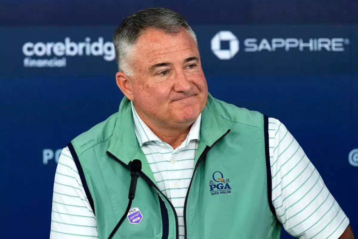 FILE - Don Rea Jr., President of the PGA of America, speaks during a news conference at the PGA Championship golf tournament at the Quail Hollow Club, Tuesday, May 13, 2025, in Charlotte, N.C. (AP Photo/Matt York)