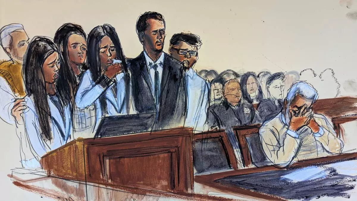 In this courtroom sketch, D'Lila Combs, left center, makes a statement surrounded by family as Sean Diddy Combs, right, reacts during his sentencing hearing in Manhattan federal court, Friday, Oct. 3, 2025, in New York. (Elizabeth Williams via AP)
