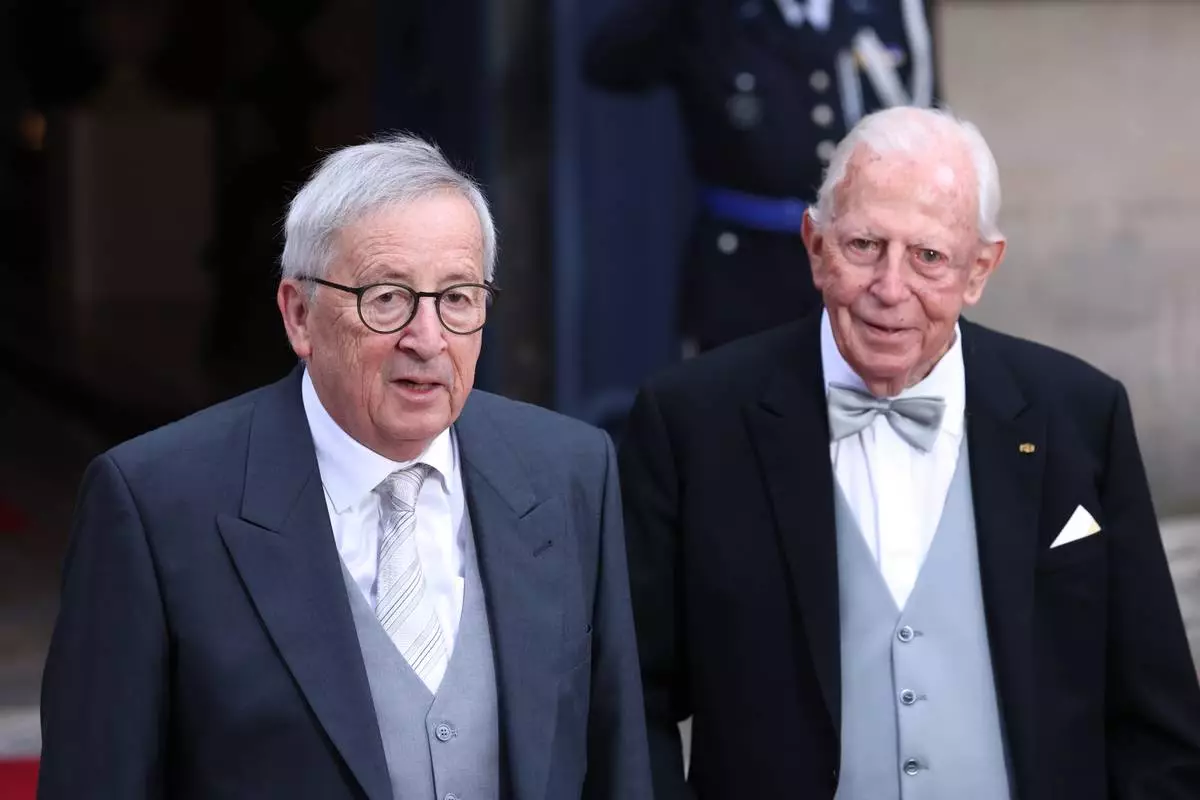 Luxembourg's Honorary Ministers of State Jean-Claude Juncker, left, and Jacques Santer arrive for the abdication and enthronement ceremony of the Grand Duke of Luxembourg at the Grand Ducal Palace in Luxembourg, Friday, Oct. 3, 2025. (AP Photo/Omar Havana)
