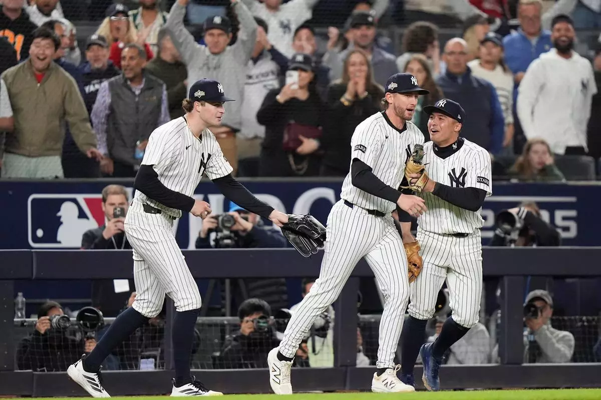 New York Yankees third base Ryan McMahon, center, is congratulated by pitcher Cam Schlittler, left, and shortstop Anthony Volpe after making a catch over the Boston Red Sox dugout during the eighth inning of Game 3 of an American League wild-card baseball playoff series, Thursday, Oct. 2, 2025, in New York. (AP Photo/Frank Franklin II)