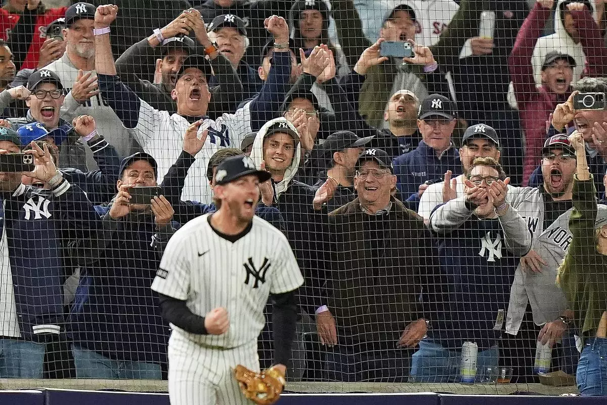 New York Yankees fans react as New York Yankees third baseman Ryan McMahon makes a catch for the final out against the Boston Red Sox to win Game 3 of an American League wild-card baseball playoff series, Thursday, Oct. 2, 2025, in New York. (AP Photo/Frank Franklin II)
