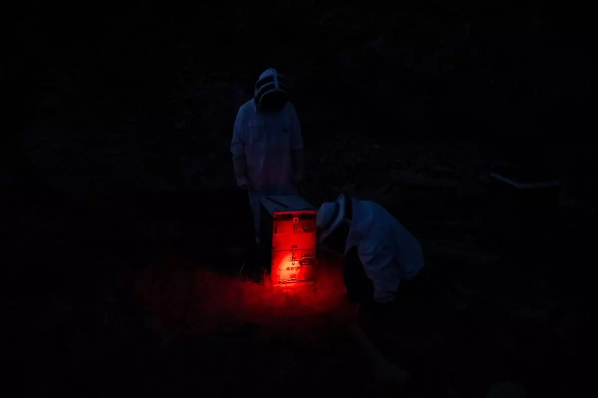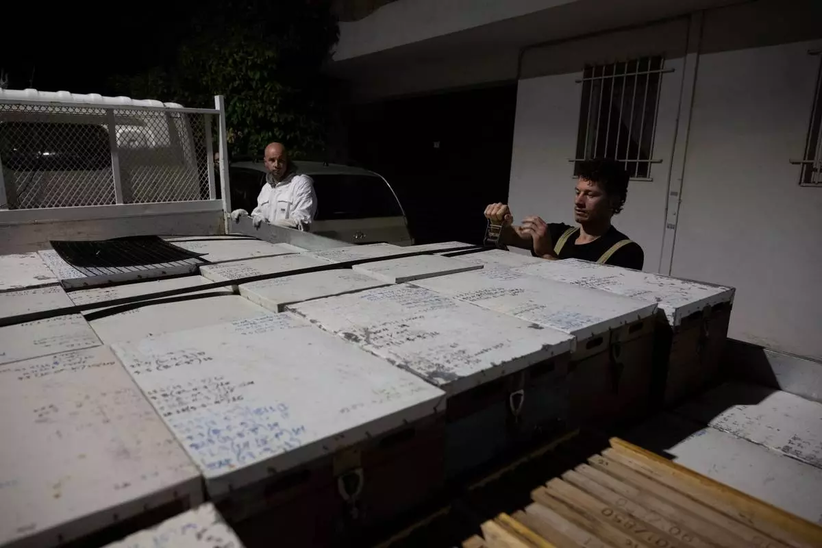 Grigoris Melas, background, and Nikos Chadjilias prepare a beehive for late-night transfer to an urban area in the Varkiza suburb of southern Athens, Greece, May 6, 2025. (AP Photo/Michael Varaklas)