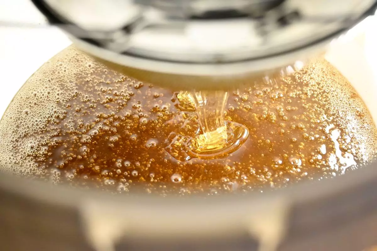 Honey is poured into a bucket in the Zografou suburb of Athens, Greece, July 1, 2025. (AP Photo/Michael Varaklas)