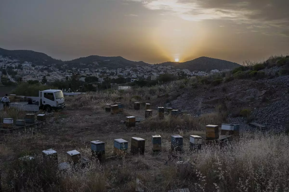 A view of an apiary is pictured as the sun sets, before a late-night beehive transfer to an urban area in the Varkiza suburb of southern Athens, Greece, May 6, 2025. (AP Photo/Michael Varaklas)