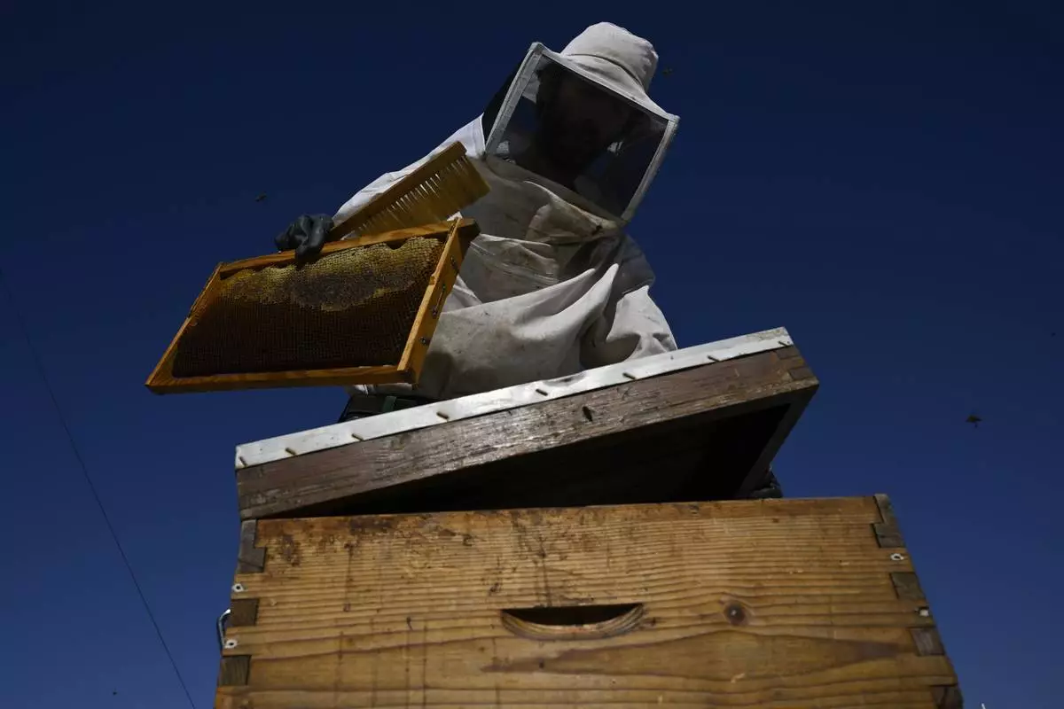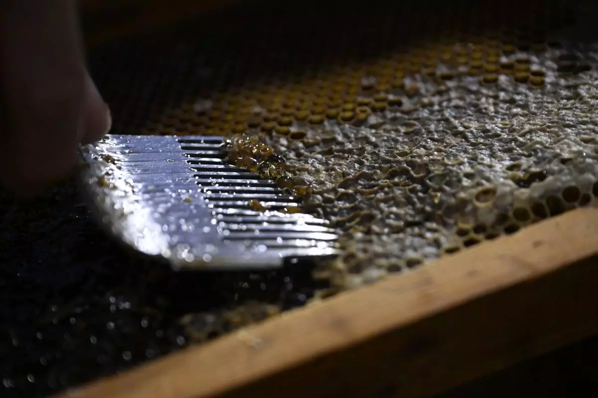 Nikos Chadjilias, a beekeeper from Athens, pinches the wax off a frame in the Zografou suburb of Athens, Greece, July 1, 2025. (AP Photo/Michael Varaklas)