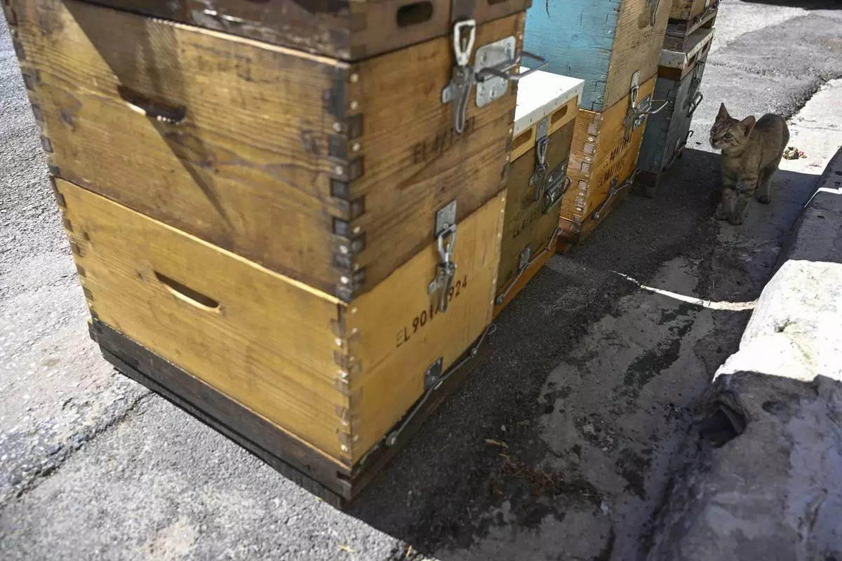A cat looks at beehives by the sidewalk in the Ilioupoli suburb of Athens, Greece, July 3, 2025. (AP Photo/Michael Varaklas)