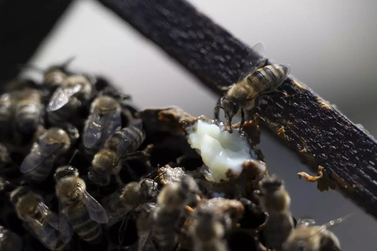 A bee touches royal jelly on a beehive's frame in Athens, Greece, May 29, 2025. (AP Photo/Michael Varaklas)
