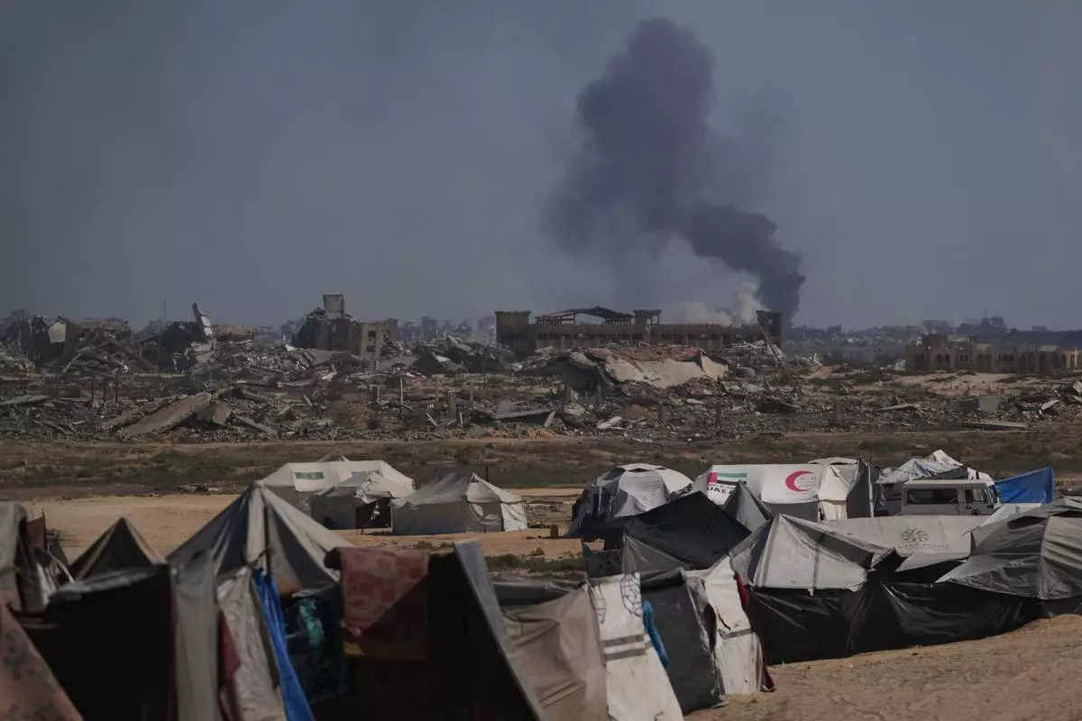 Smoke rises to the sky following an Israeli military strike in Gaza City, as seen from the central Gaza Strip, Thursday, Oct. 2, 2025. (AP Photo/Abdel Kareem Hana)