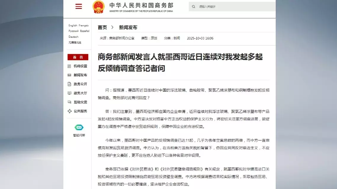According to the spokesperson, China has noticed that the Mexican Ministry of Economy has launched four anti-dumping investigations into China's float glass, self-adhesive tape, PVC-coated fabric, and steel bolts. China firmly opposes the protectionist practices that undermine the legitimate rights and interests of Chinese enterprises, and will closely monitor the progress of Mexico's investigations.