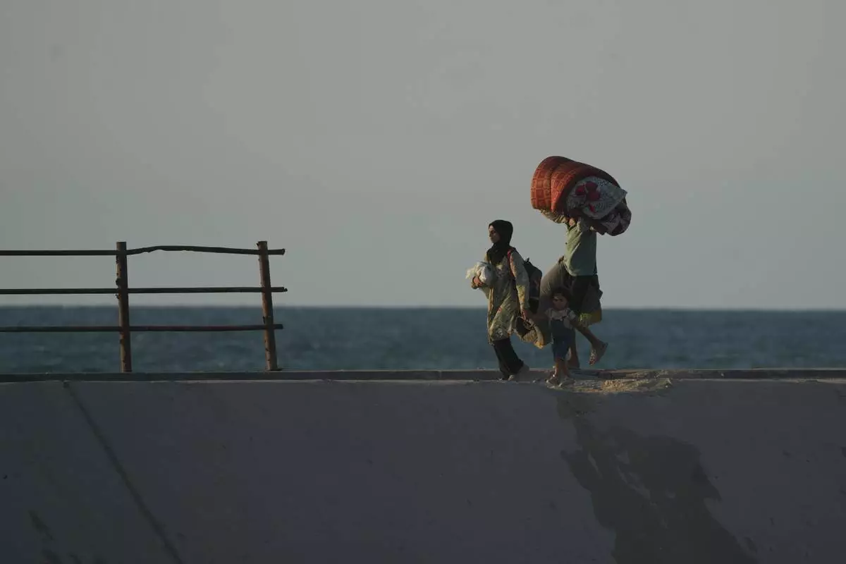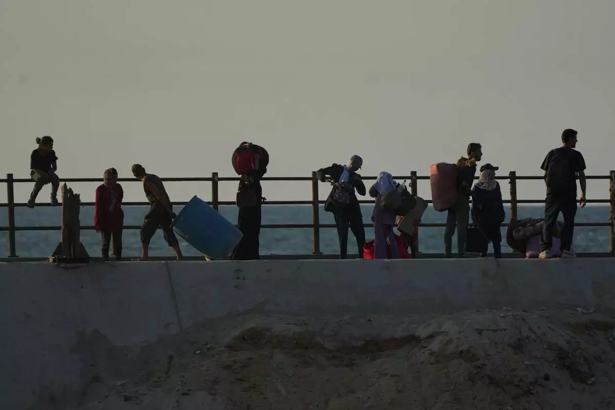 Displaced Palestinians flee northern Gaza carrying their belongings along the coastal road near Wadi Gaza, Thursday, Oct. 2, 2025. (AP Photo/Abdel Kareem Hana)