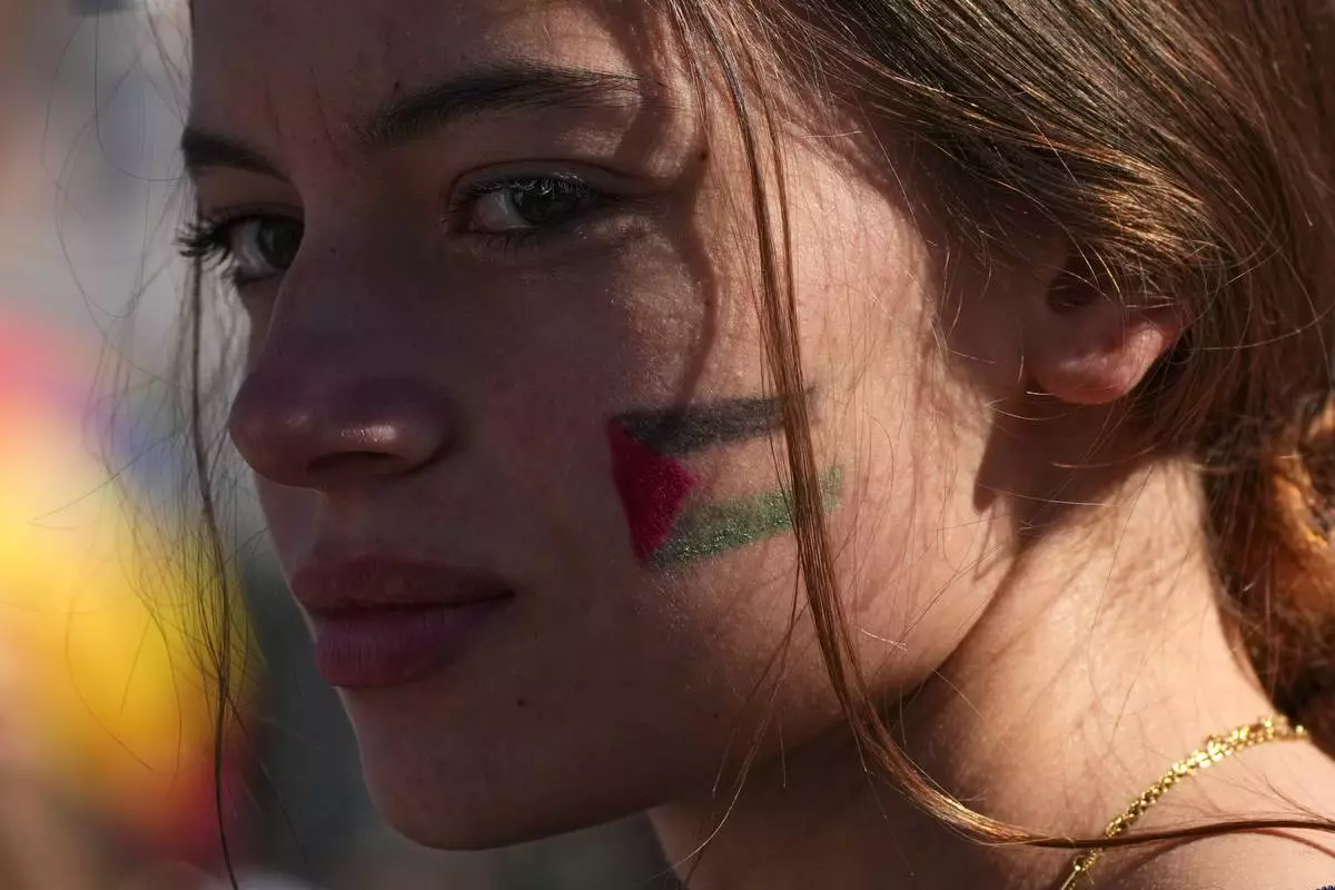 A pro-Palestinian demonstrator gathers for a national general strike called by different unions to protest against the situation in Gaza two days after Israeli forces intercepted a Gaza-bound aid flotilla in the Mediterranean Sea, in Rome, Friday, Oct. 3, 2025. (AP Photo/Alessandra Tarantino)