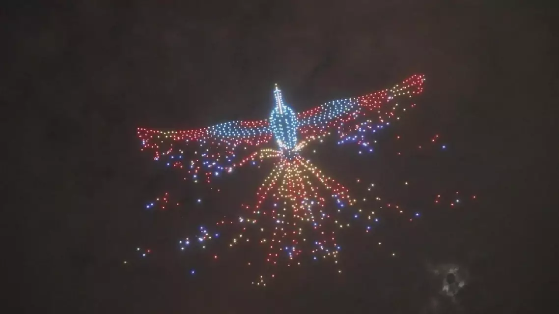 A dazzling drone light show lit up the night sky over Suining City in southwest China's Sichuan Province. More than 1,300 drones rose in precise formations under the careful guidance of ground staff, shifting into intricate patterns that mesmerized the crowd.