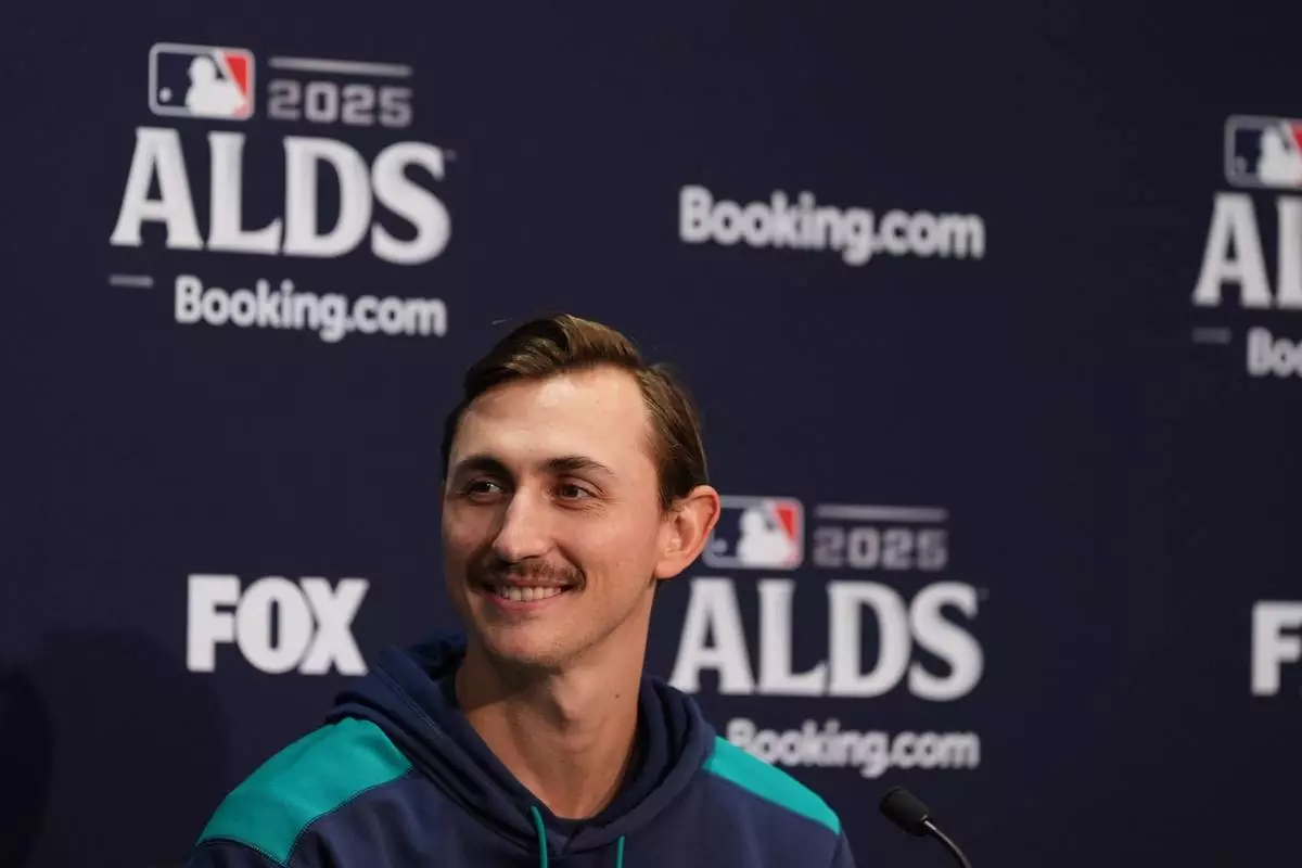 Seattle Mariners starting pitcher George Kirby smiles during a news conference, Friday, Oct. 3, 2025, in Seattle, the day before Game 1 of baseball's American League Division Series against the Detroit Tigers. (AP Photo/Lindsey Wasson)