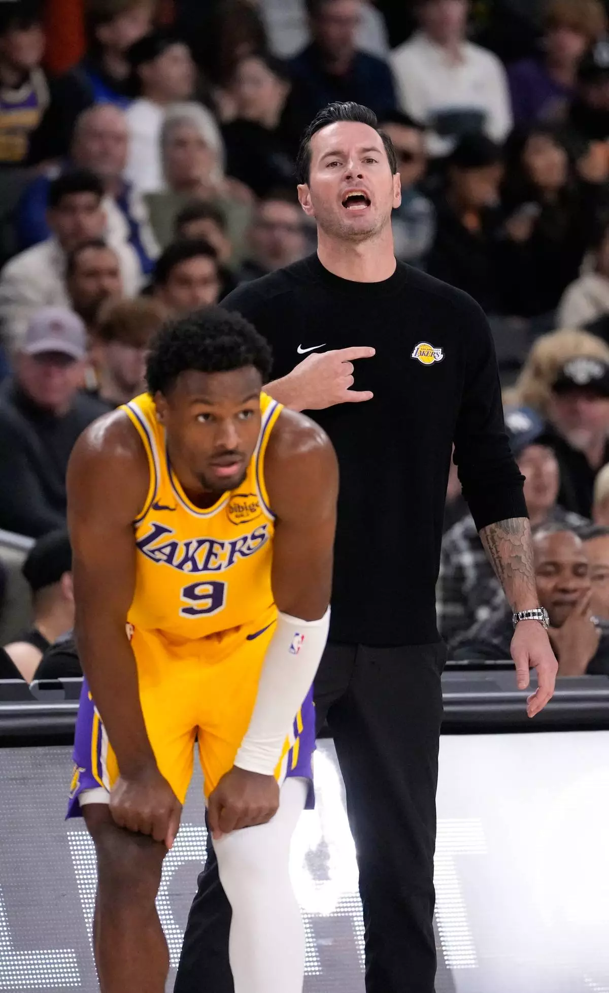 Los Angeles Lakers head coach JJ Redick, right, yells to his team as guard Bronny James stands by during the second half of an NBA preseason basketball game against the Phoenix Suns, Friday, Oct. 3, 2025, in Palm Desert, Calif. (AP Photo/Mark J. Terrill)