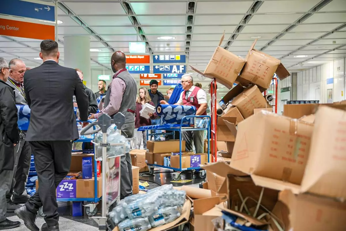 Drinks and snacks are distributed after possible drone sightings closed Munich Airport, Saturday, Oct. 4, 2025, in Munich, Germany. (Enrique Kaczor/onw-images/dpa via AP)