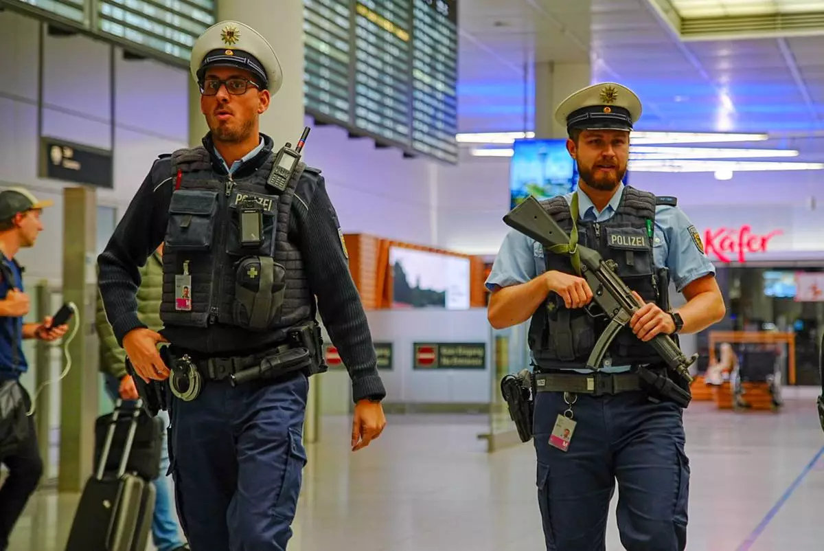 Police officers patrol Munich Airport after the airport shut down operations due to possible new drone sightings Friday, Oct. 3, 2025, in Munich. (Enrique Kaczor/dpa via AP)