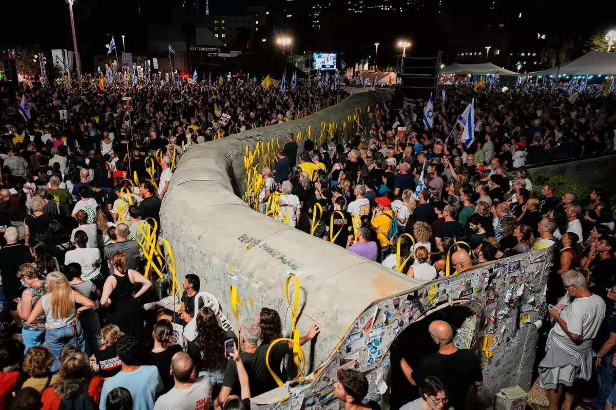 People attend a rally calling for the release of all hostages held by Hamas in the Gaza Strip and urges a ceasefire, in Tel Aviv, Israel, Saturday, Oct. 4, 2025. ahead of the second anniversary of the Israel-Hamas war. (AP Photo/Ohad Zwigenberg)