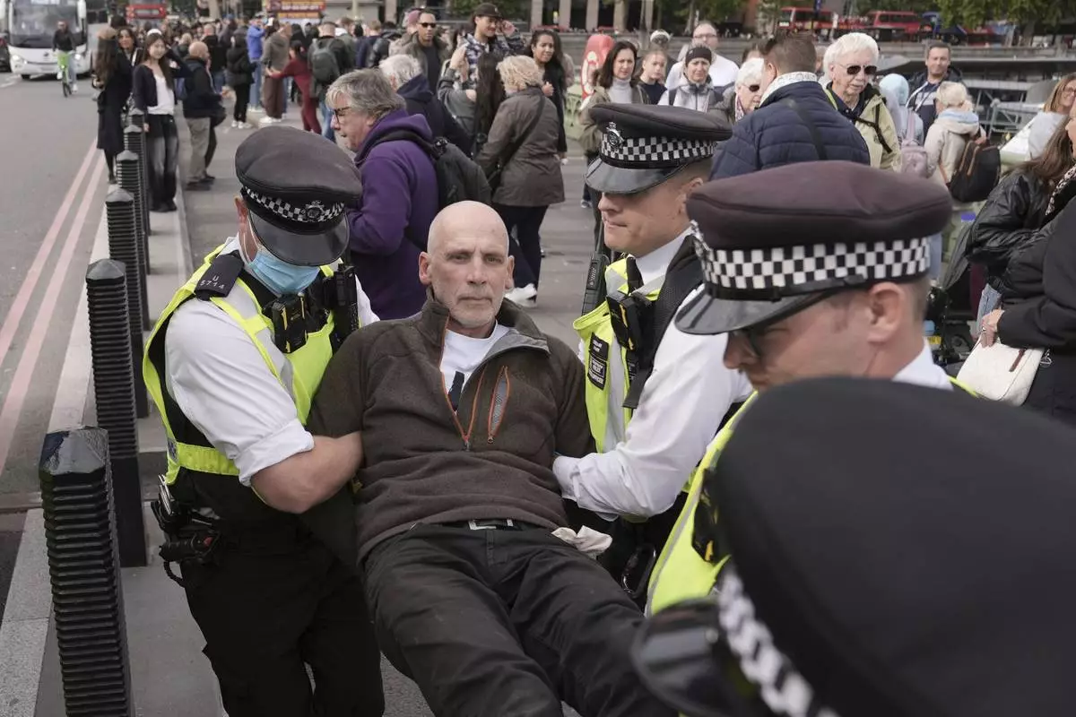 Police remove a protester after a banner was unfurled on Westminster Bridge, London, as part of a demonstration organised by Defend our Juries, in support of Palestine Action, Saturday Oct. 4, 2025. (Stefan Rousseau/PA via AP)