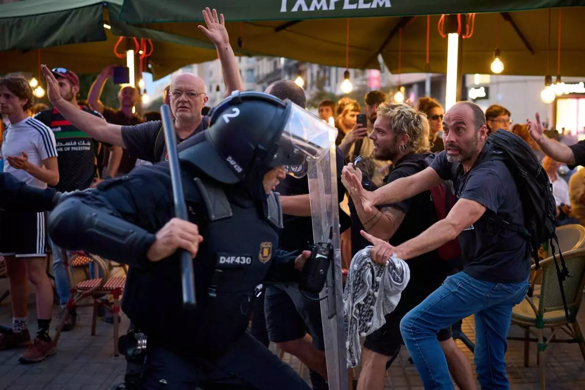 Police officers clash with protesters during a pro-Palestinian rally in solidarity with the Global Sumud Flotilla after ships were intercepted by the Israeli navy, in Barcelona, Spain, Saturday, Oct. 4, 2025. (AP Photo/Emilio Morenatti)
