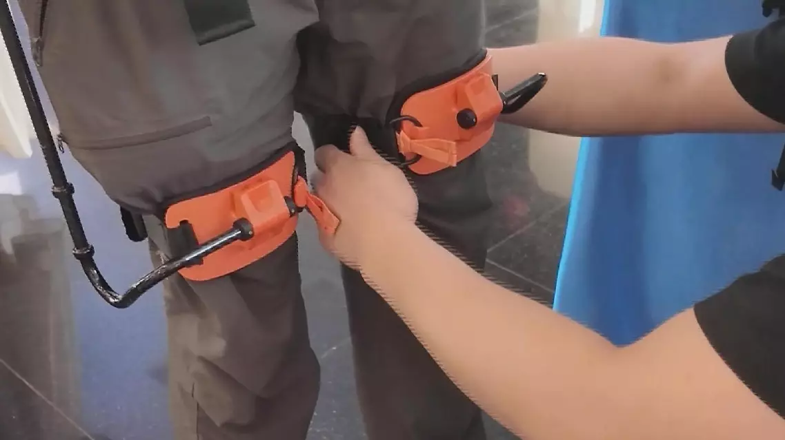 Wrapping around a wearer's waist and thighs, the exoskeleton robot senses the user's pace and movement, providing synchronized assistance to reduce joint strain and fatigue, alleviating the effort by about 40 percent.