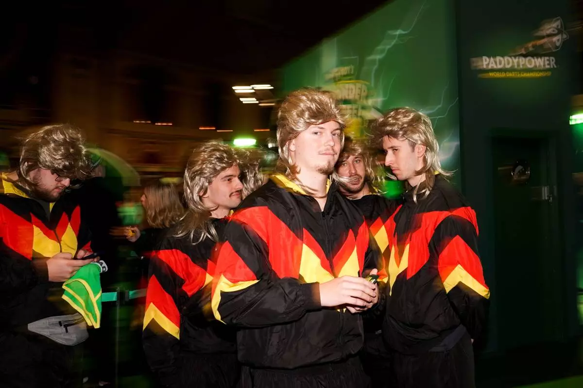FILE - Fans dressed in costumes arrive for the start of the round 4 match between Stephen Bunting of England and Luke Woodhouse of England at the World Darts Championship in London, Dec. 30, 2024. (AP Photo/Alberto Pezzali, File)