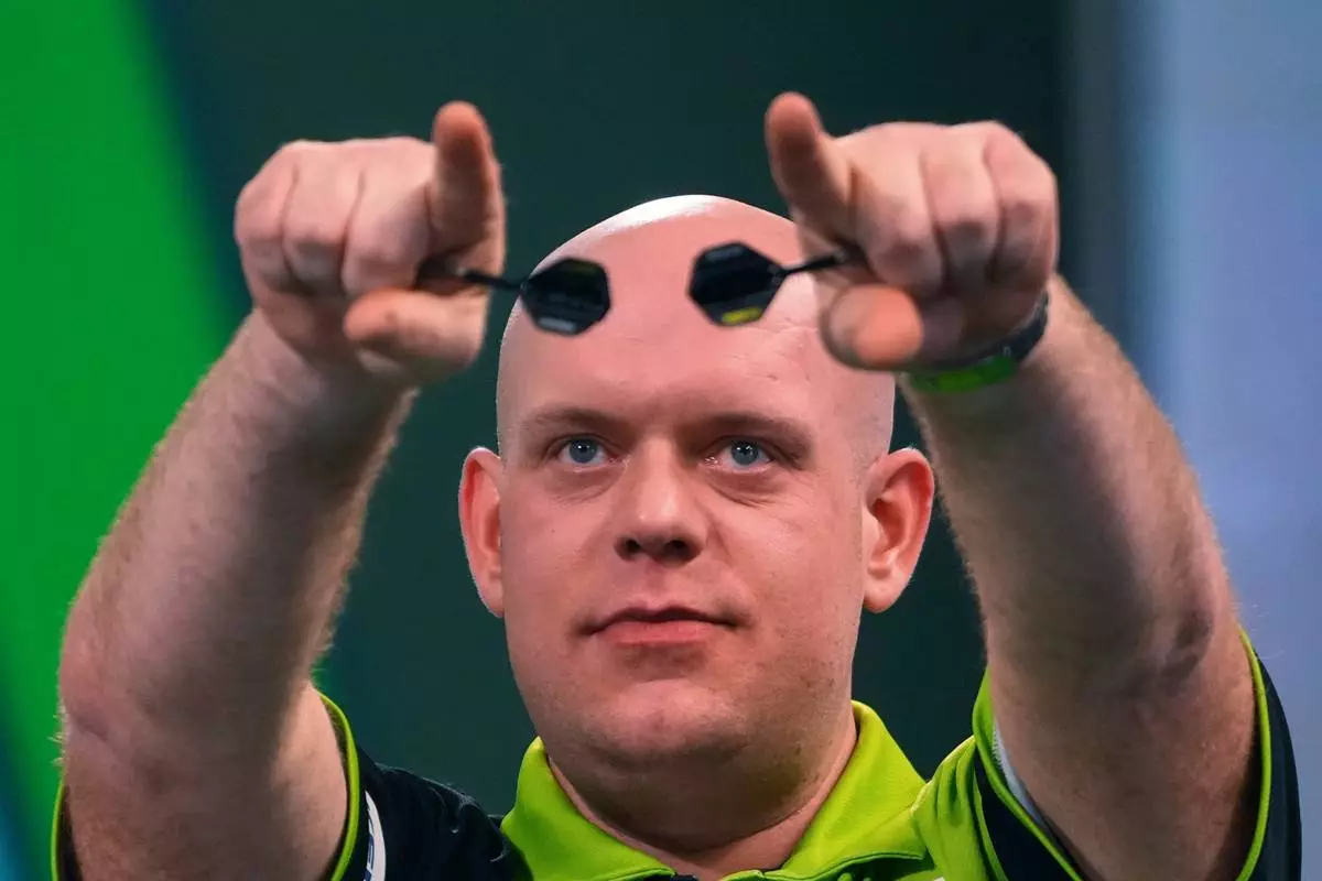 FILE - Michael van Gerwen of the Netherlands celebrates after winning the semifinal match against Chris Dobey of England, at the World Darts Championship in London, Jan. 2, 2025. (AP Photo/Kirsty Wigglesworth, File)