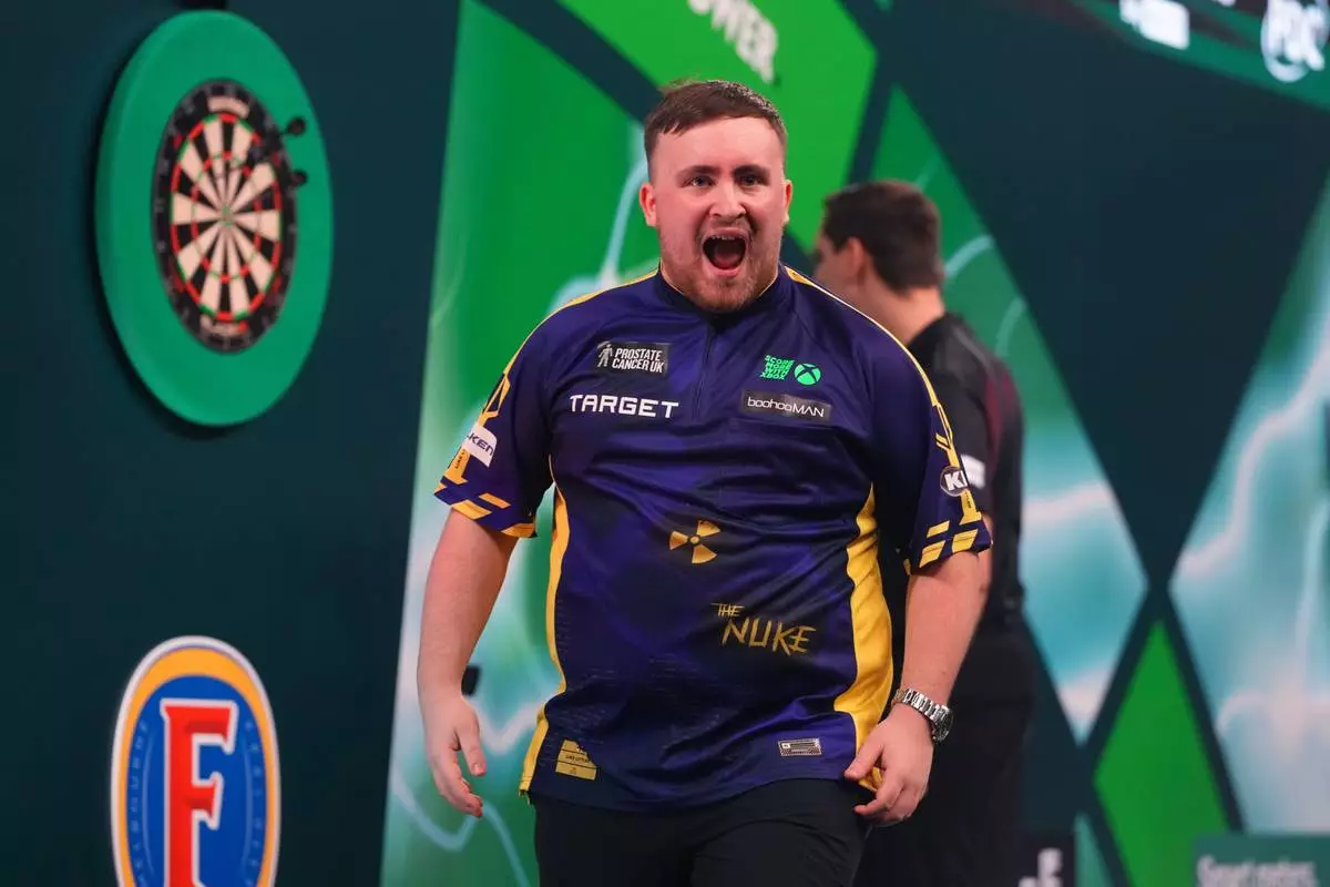 FILE - Luke Littler of England reacts during the semifinal match against Stephen Bunting of England, at the World Darts Championship in London, Jan. 2, 2025. (AP Photo/Kirsty Wigglesworth, File)