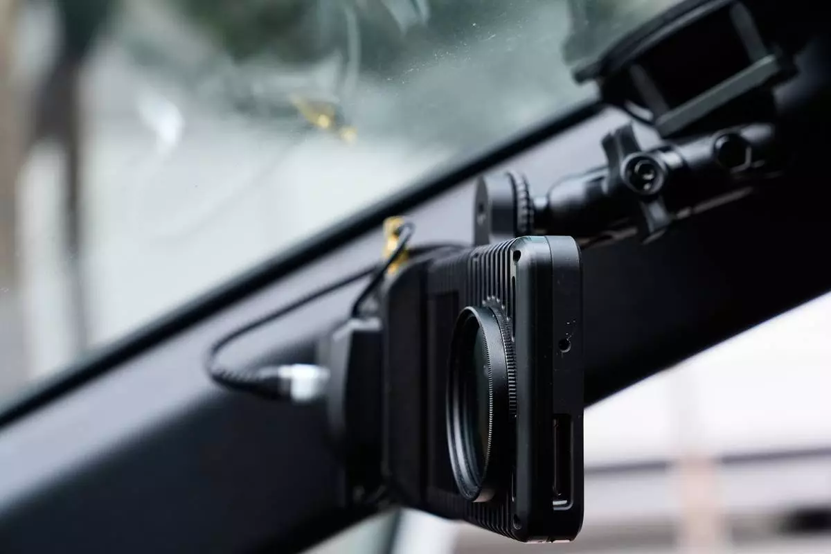 A small detection camera – which uses AI to detect road hazards and potholes – is seen mounted inside a parking enforcement vehicle, in San Jose, Calif., Wednesday, Nov. 12, 2025. (AP Photo/Godofredo A. Vásquez)
