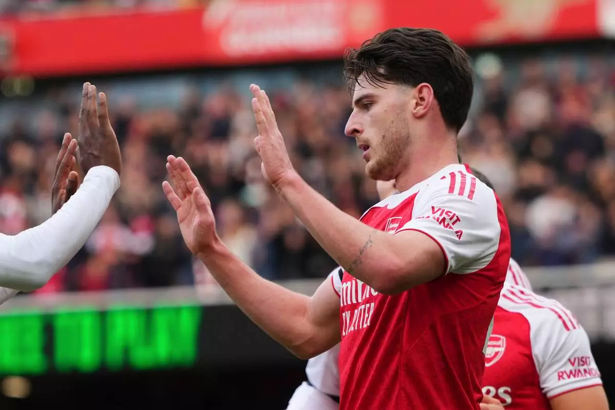 Arsenal's Declan Rice celebrates with teammates after scoring the opening goal during the substitution at the English Premier League soccer match between Arsenal and West Ham United at the Emirates stadium in London, Saturday, Oct. 4, 2025. (AP Photo/Kirsty Wigglesworth)