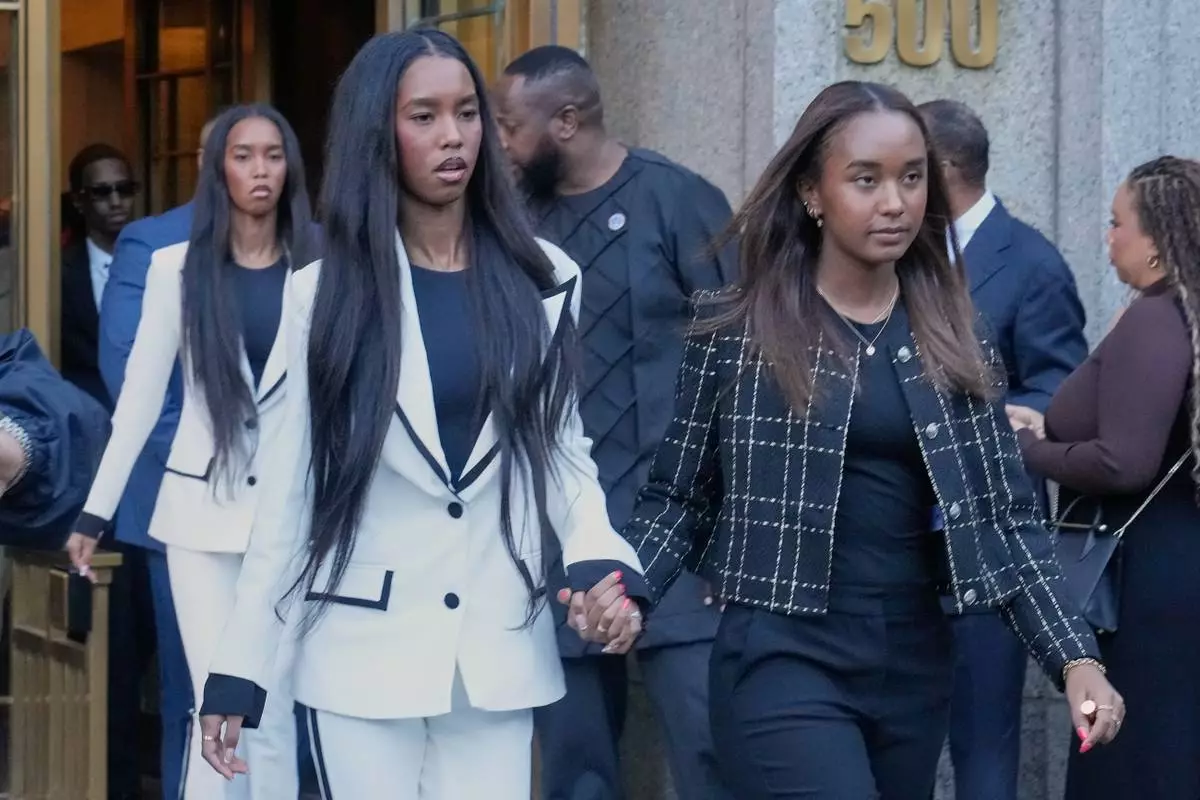 The twin daughters of Sean "Diddy" Combs, Chance Combs, right, and D'Lila Star Combs, leave Federal Court, in New York, Friday, Oct. 3, 2025. (AP Photo/Richard Drew)