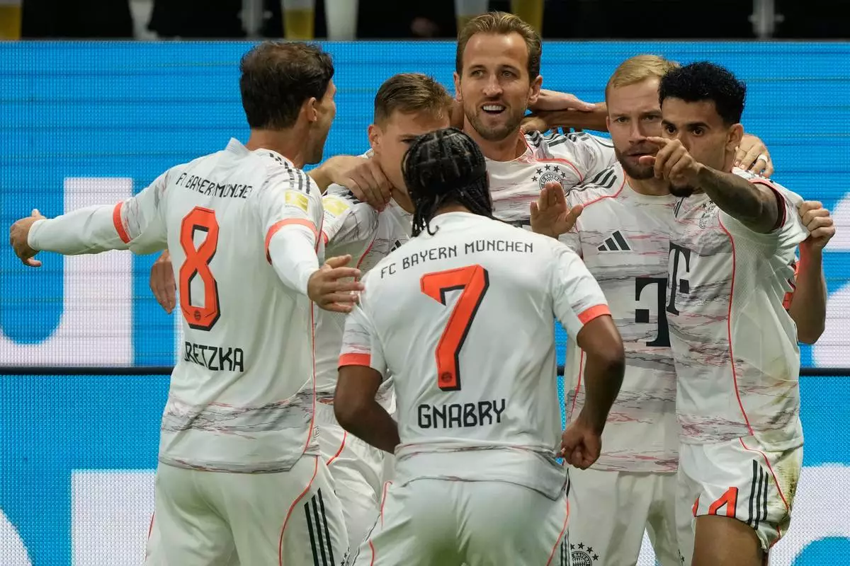 Bayern' s Luis Diaz , right, celebrates with team mates Leon Goretzka, from left, Serge Gnabry, Joshua Kimmich, Harry Kane, Konrad Laimer after scoring his side's opening goal during the Bundesliga soccer match between Eintracht Frankfurt and FC Bayern Munich in Frankfurt, Germany, Saturday, Oct. 4, 2025. (AP Photo/Michael Probst)