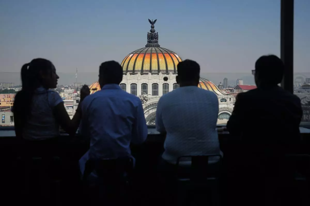 People sit at a rooftop bar overlooking Mexico City's Fine Arts Palace, where the Mexican coat of arms is visible atop the building's dome, Thursday, Nov. 13, 2025. (AP Photo/Claudia Rosel)