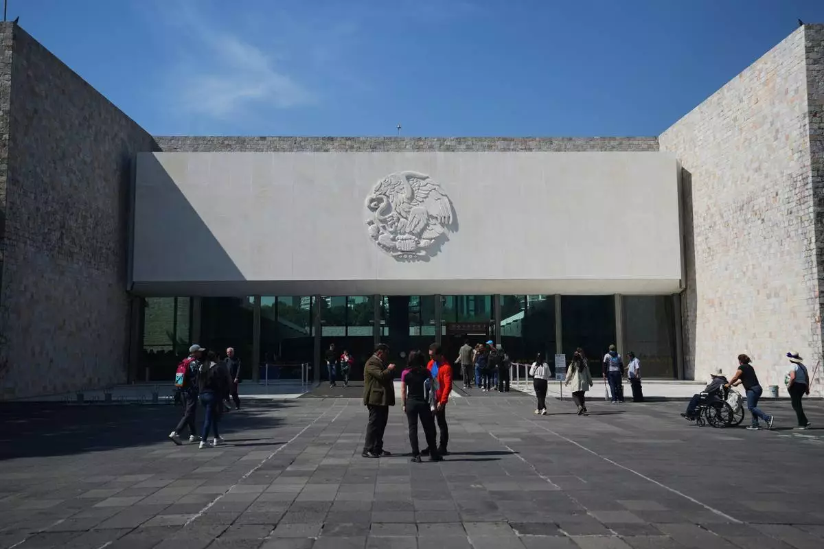 The entrance of Mexico City's National Museum of Anthropology features Mexico's national emblem on its façade, Friday, Nov. 14, 2025. (AP Photo/Claudia Rosel)