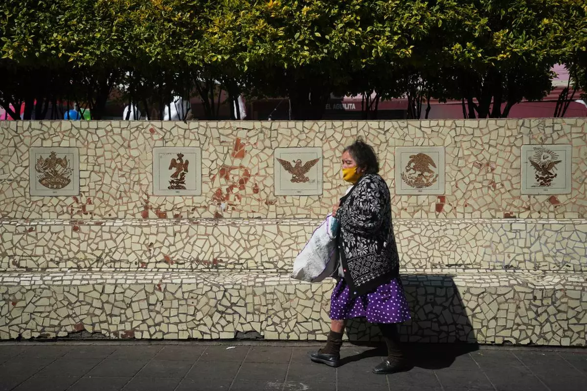 People at the square of Aguilita in Mexico City walk past a central sculpture depicting Mexico's coat of arms which shows an eagle perched on a cactus devouring a rattlesnake, Thursday, Nov. 13, 2025. (AP Photo/Claudia Rosel)