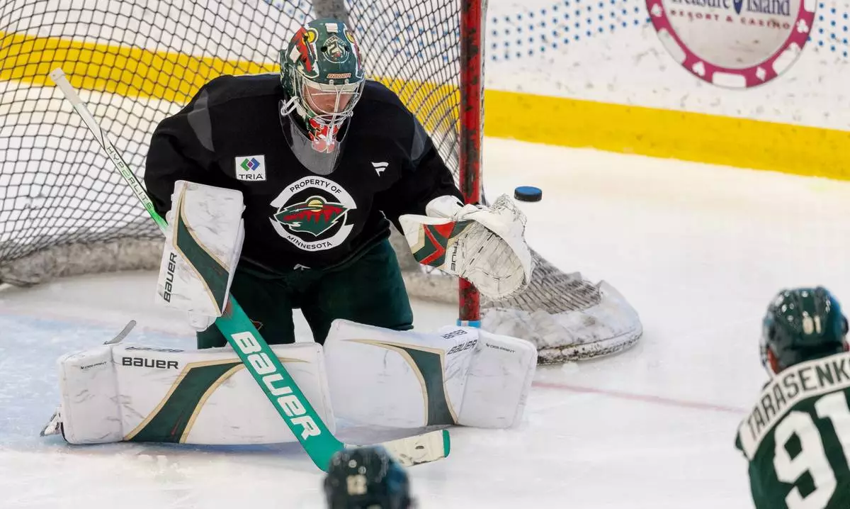 Minnesota Wild goalie Filip Gustavsson (32) defends the net during NHL hockey training camp at Tria Rink in St. Paul, Minn., Thursday, Sept. 18, 2025. (Carlos Gonzalez/Star Tribune via AP)