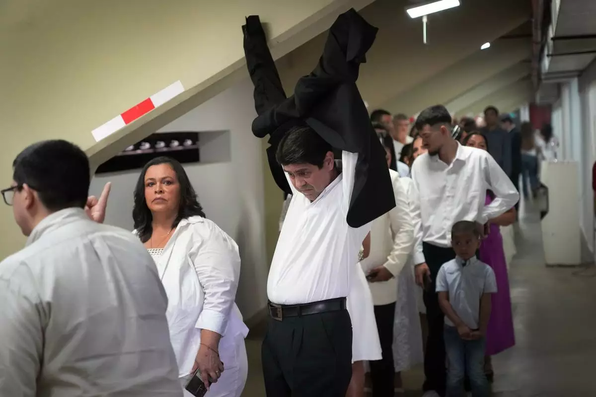 Couples arrive to a stadium to exchange vows during in a group ceremony organized by the Civil Registry to legally formalize their unions in in Asuncion, Paraguay, Saturday, Oct. 4, 2025. (AP Photo/Jorge Saenz)
