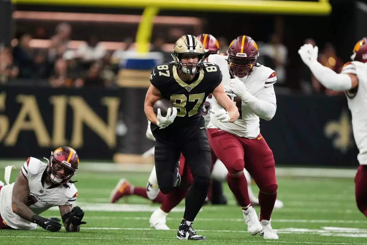 FILE - New Orleans Saints tight end Foster Moreau (87) carries after a reception in the second half of an NFL football game against the Washington Commanders in New Orleans, Dec. 15, 2024. (AP Photo/Gerald Herbert, File)