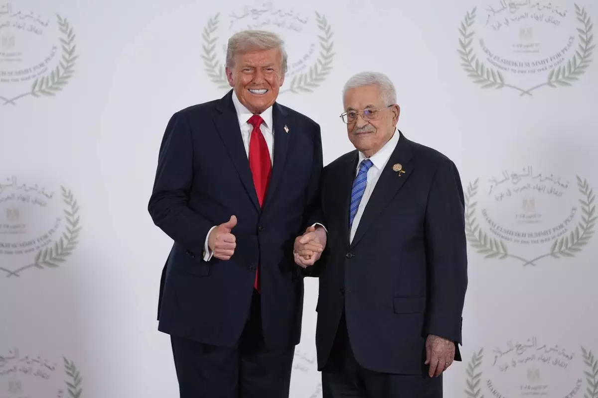 FILE.- President Donald Trump greets Palestinian President Mahmoud Abbas during a summit to support ending the more than two-year Israel-Hamas war in Gaza after a breakthrough ceasefire deal, Monday, Oct. 13, 2025, in Sharm El Sheikh, Egypt. (AP Photo/Evan Vucci, File)