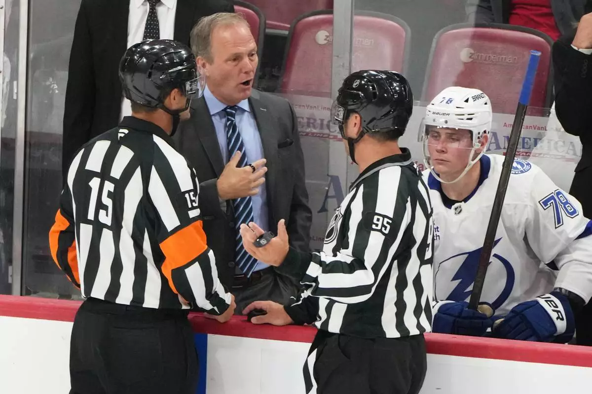 Tampa Bay Lightning head coach Jon Cooper, second from left, talks with officials during the third period of an NHL hockey preseason game against the Florida Panthers, Saturday, Oct. 4, 2025, in Sunrise, Fla. (AP Photo/Lynne Sladky)