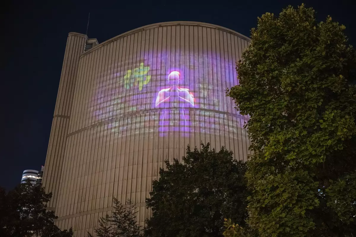 Adapted from its original version displayed at the M+ Façade in Hong Kong in 2022, the artwork uses light as its medium and draws inspiration from the Heart Sutra, a central Buddhist scripture. The adapted version responds to the local historical and architectural context, integrating AI-generated models and light-reactive animation.
