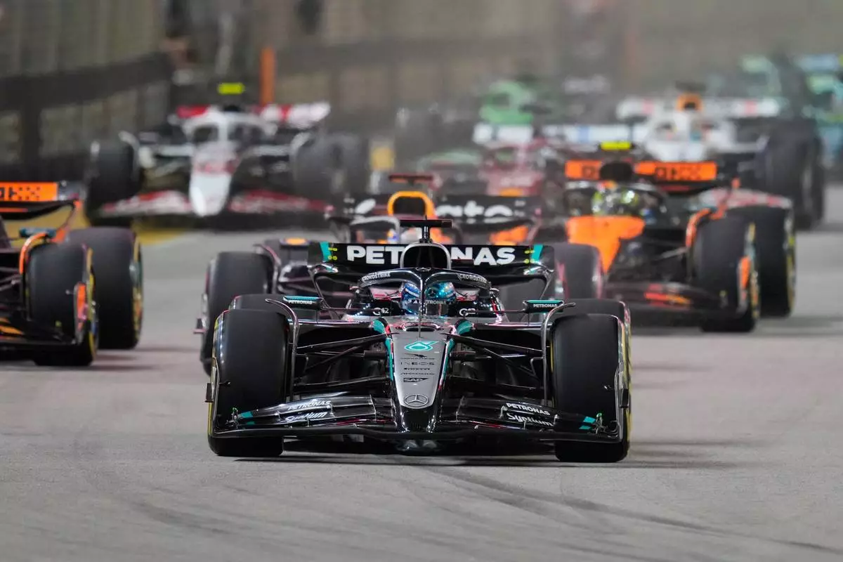 Mercedes driver George Russell of Britain leads the field after the start during the Singapore Formula One Grand Prix at the Marina Bay Street Circuit in Singapore, Sunday, Oct. 5, 2025. (AP Photo/Vincent Thian)