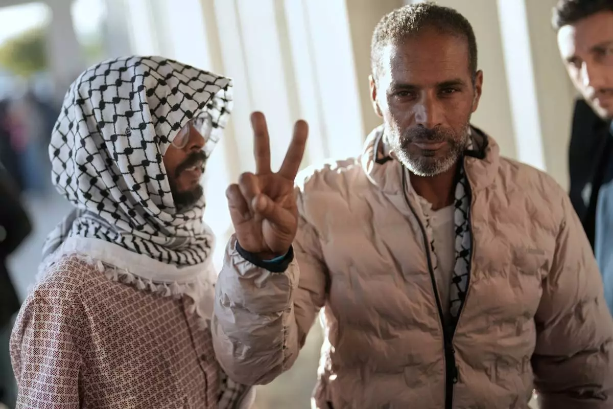 Activists from the Global Sumud Flotilla give the peace sign after arriving at Istanbul Airport in Istanbul, Turkey, Saturday, Oct. 4, 2025. (AP Photo/Khalil Hamra)