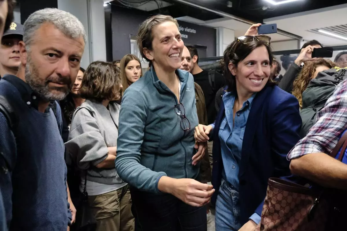 Italian Democratic party leader Elly Schlein, right, welcomes members of Italian Parliament Arturo Scotto, left, and Annalisa Corrado upon their landing at the Rome Leonardo da Vinci airport after being released by Israeli authorities following their detention for being aboard boats of the Global Sumud Flottila. (Mauro Scrobogna/LaPresse via AP)