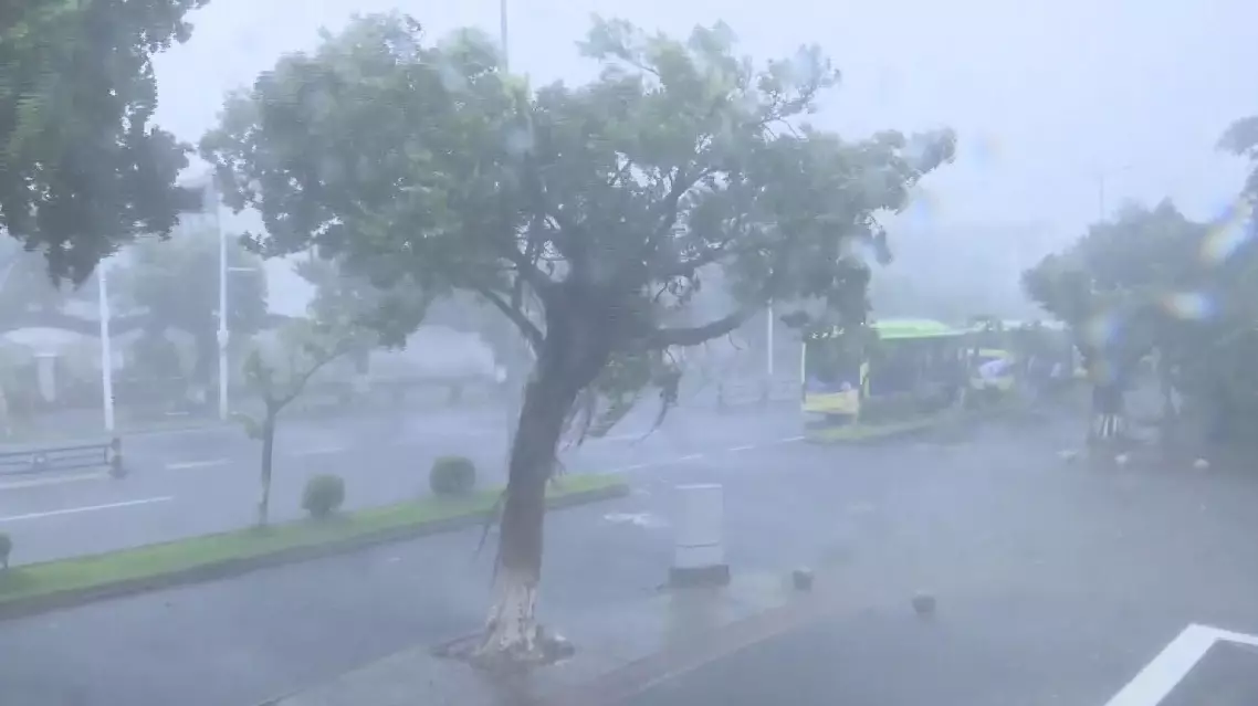 In the coastal town of Jinhe, situated along the eastern shoreline of Xuwen County, the wind speeds have reached gusts equivalent to level 14 on the Beaufort scale, causing metal sheets to be scattered around and trees to topple.