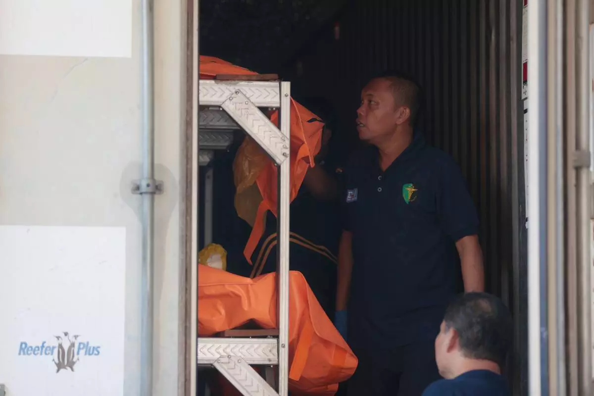 Rescuers arrange the bodies of the victims of a building that collapsed at an Islamic boarding school inside a refrigerated container at the police hospital in Surabaya, East Java, Indonesia, Sunday, Oct. 5, 2025. (AP Photo/Trisnadi)